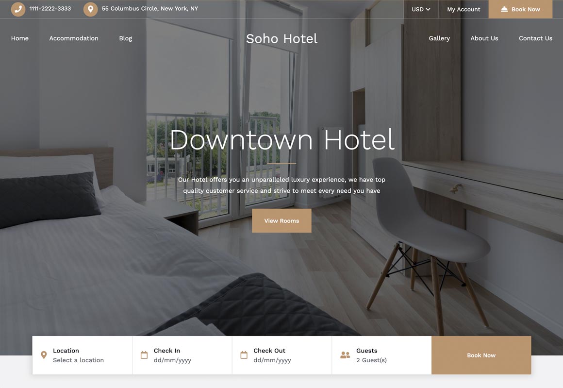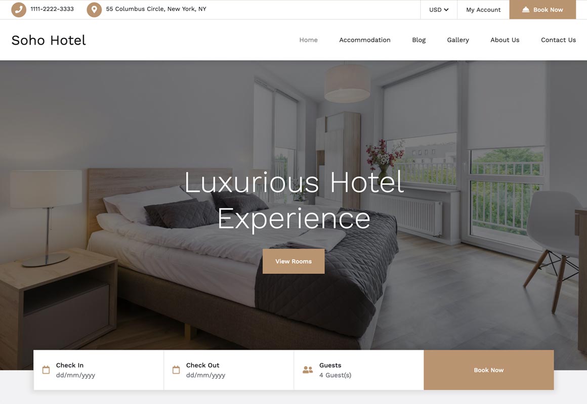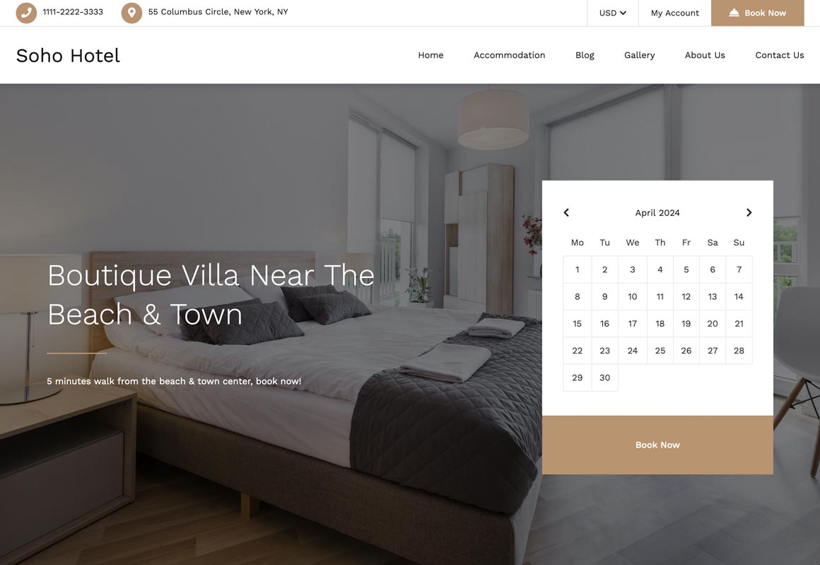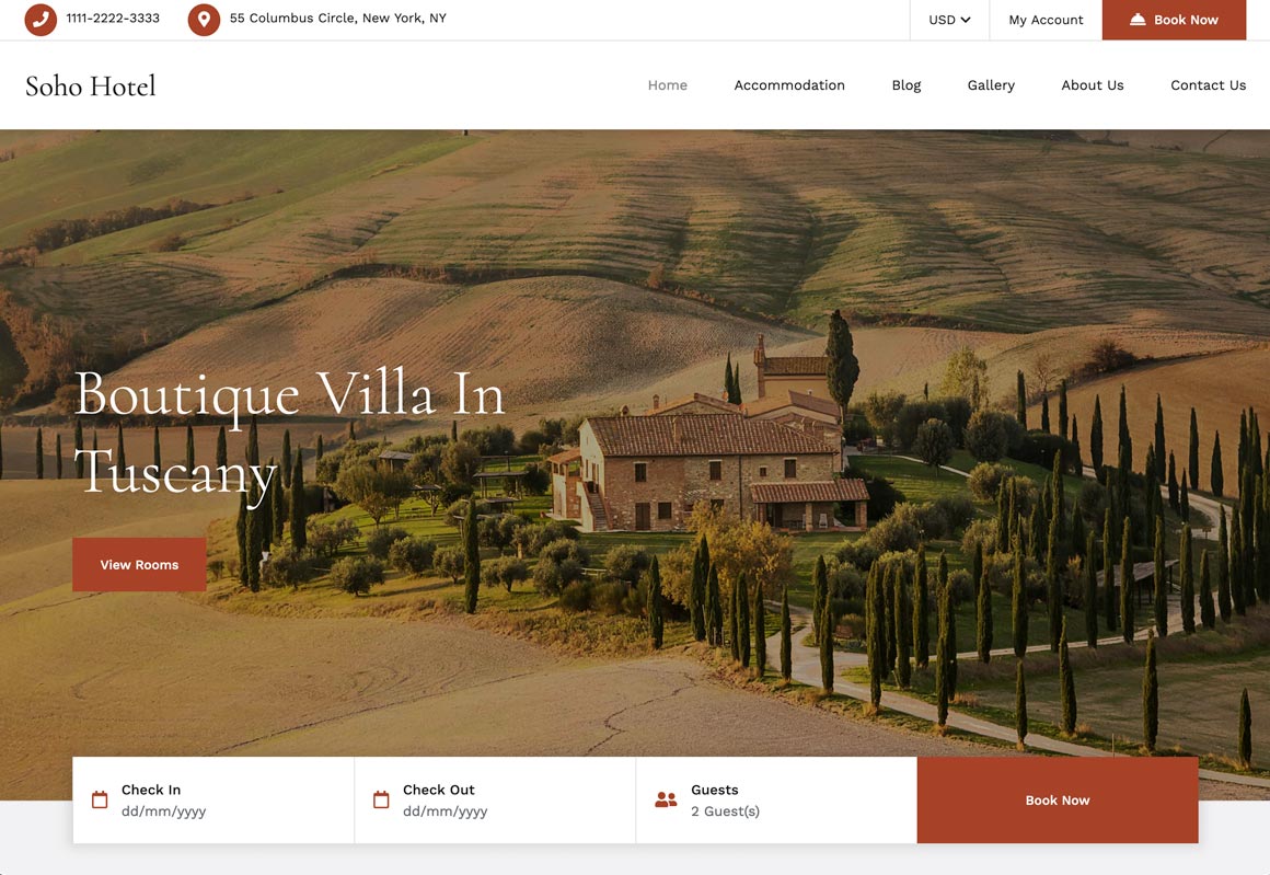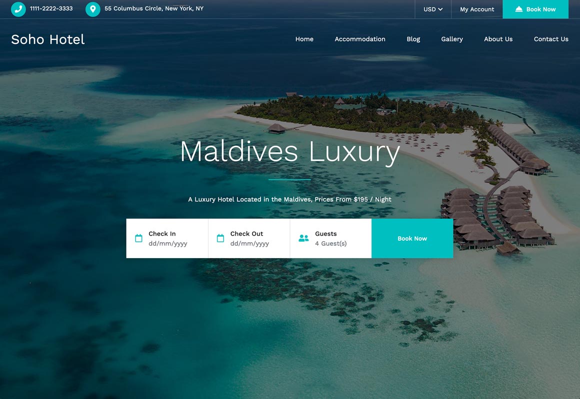 Soho Hotel Booking Theme/Calendar is by far the best I came across in the WordPress pool of hotel themes. The power of customisation and sleek design is second to none.