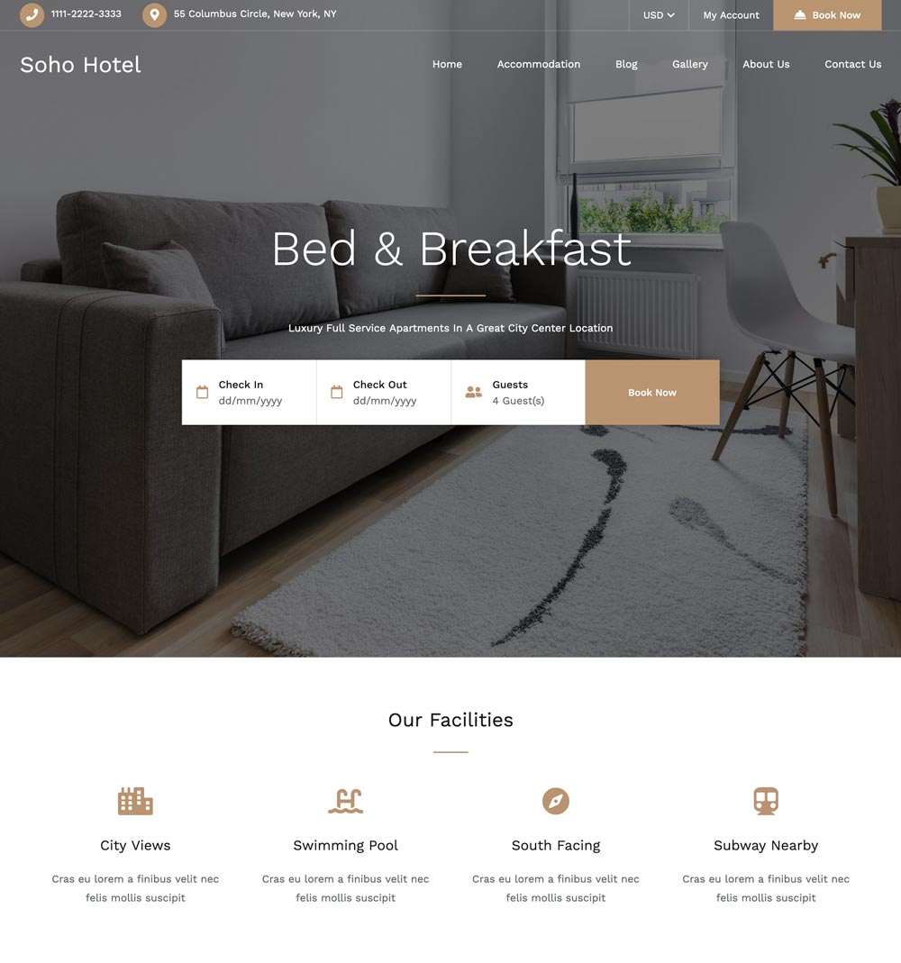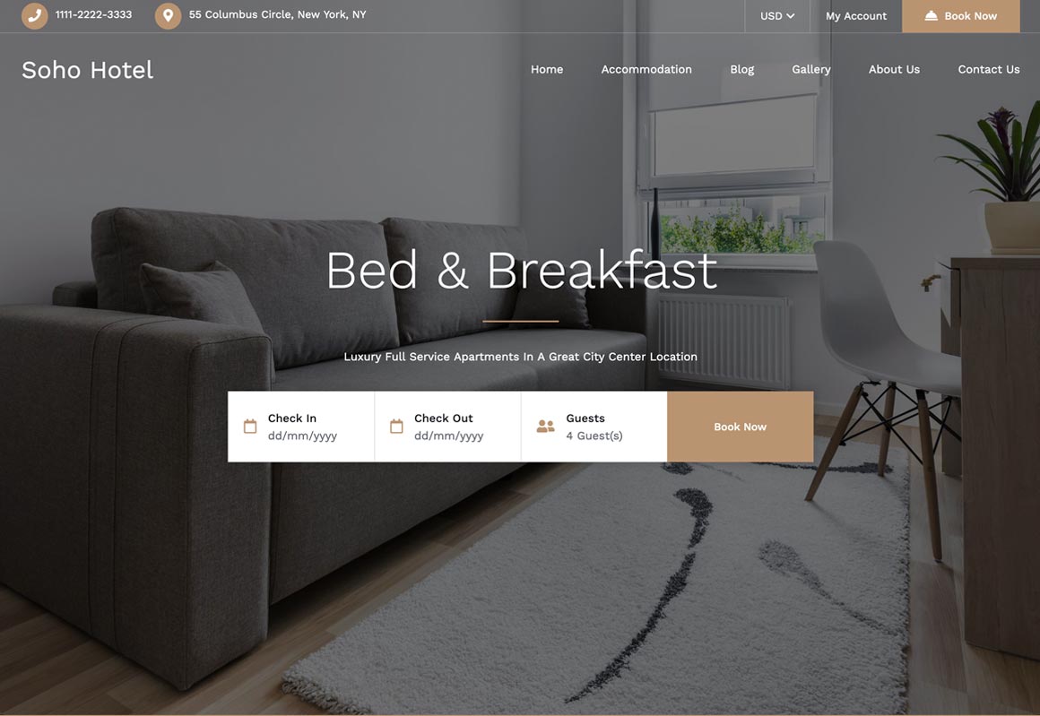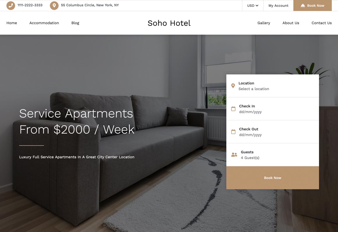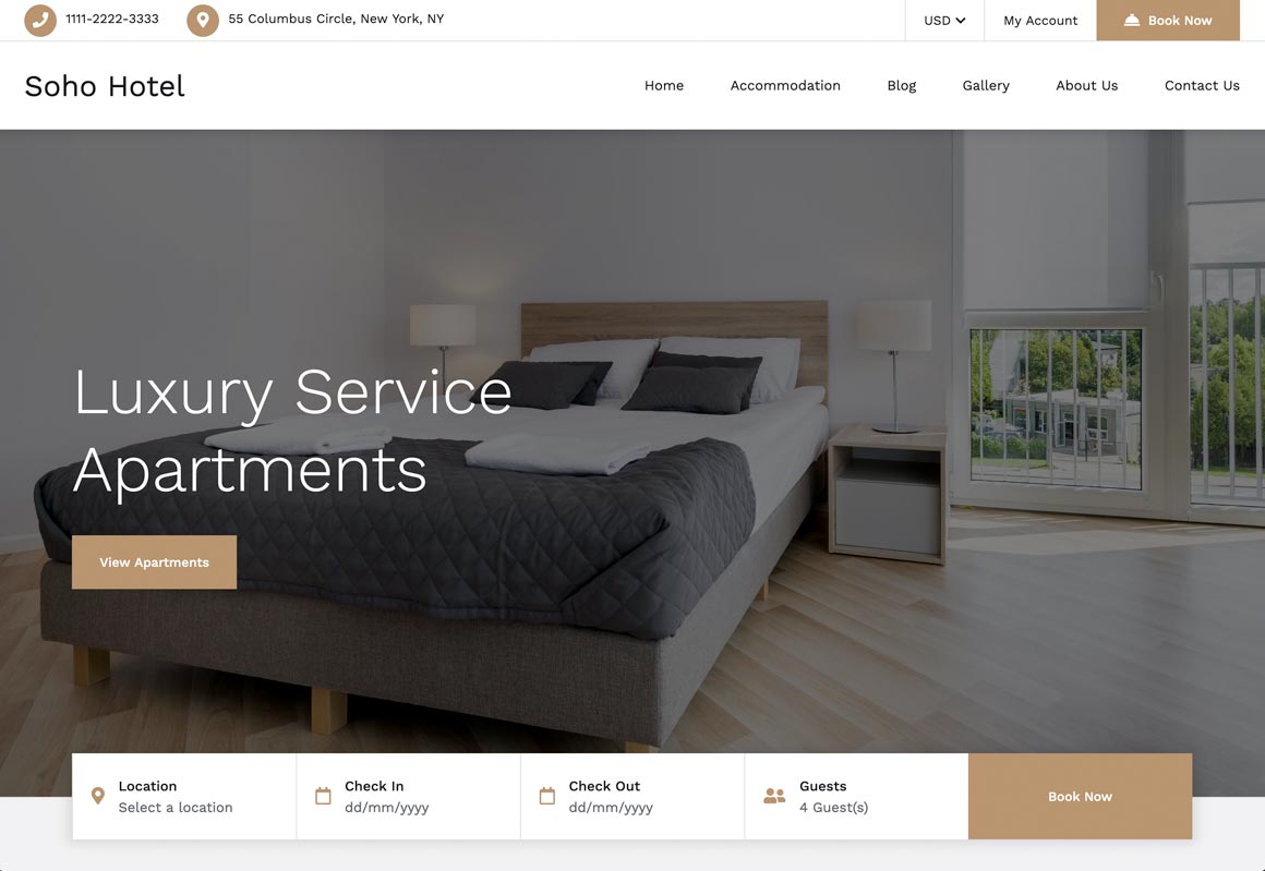 Soho Hotel Booking Theme/Calendar is by far the best I came across in the WordPress pool of hotel themes. The power of customisation and sleek design is second to none.