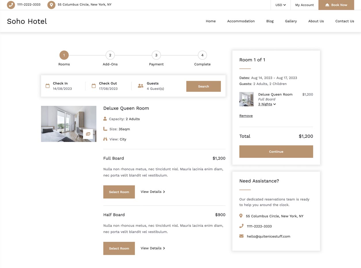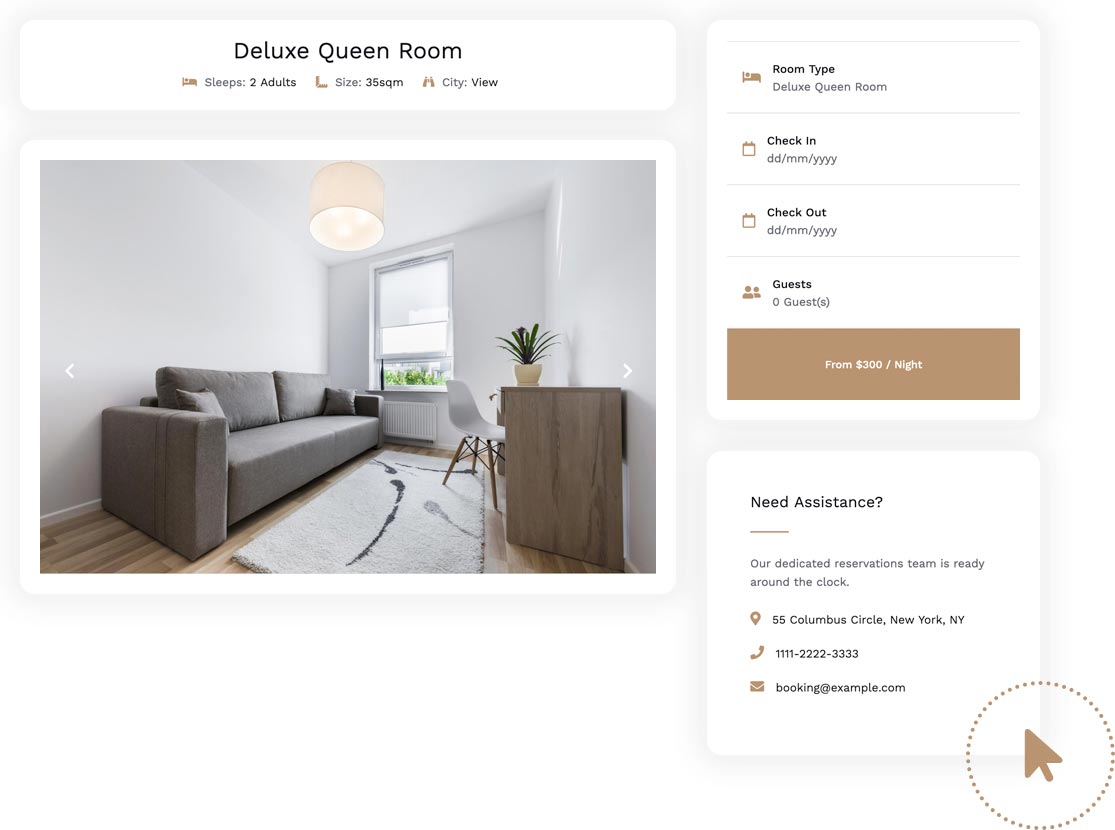 Soho Hotel comes packaged with it's own booking system custom built based on years of customer feedback. It should contain every feature you need, but if you feel something is missing please get in touch, I'm always open to feedback and feature requests